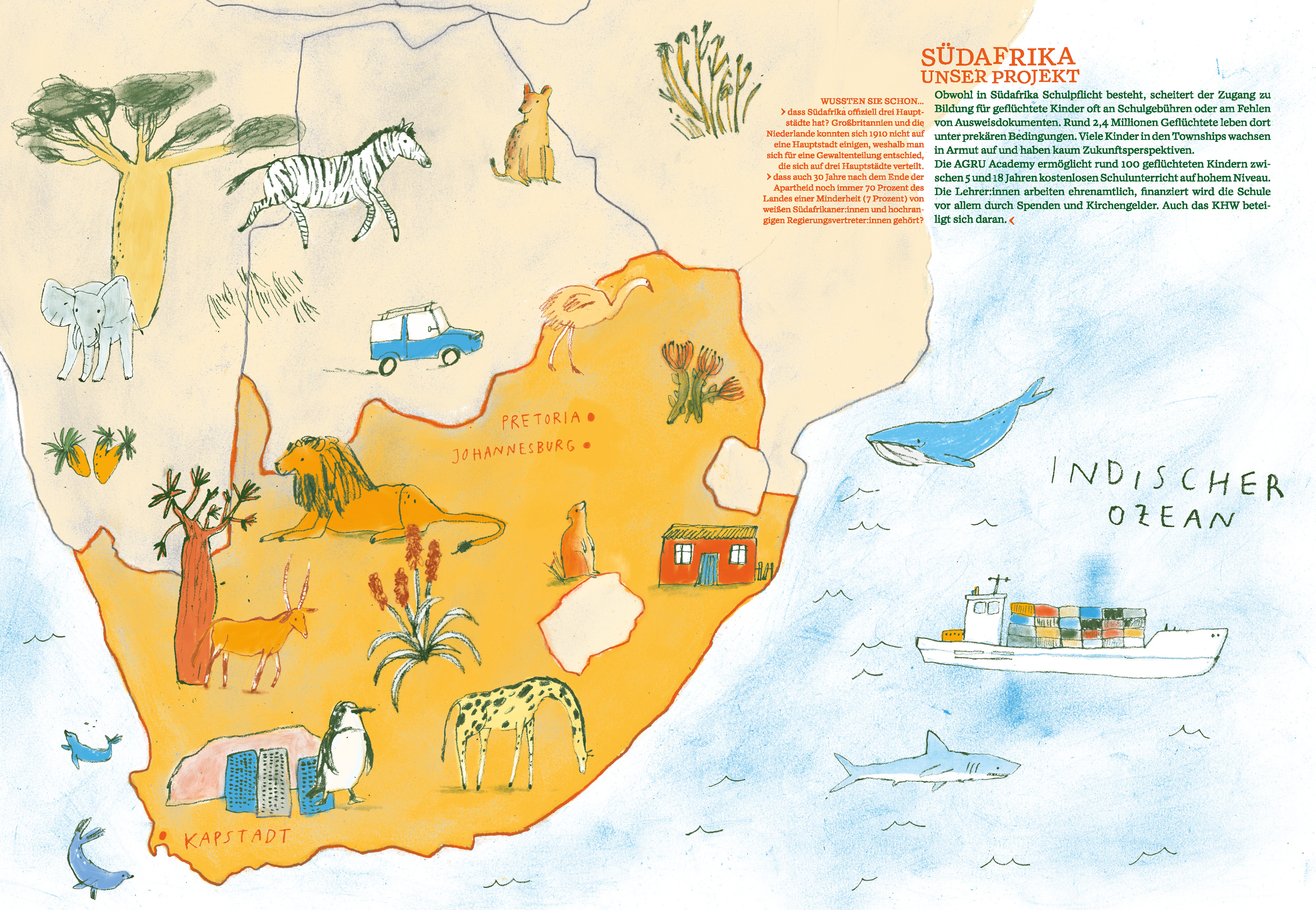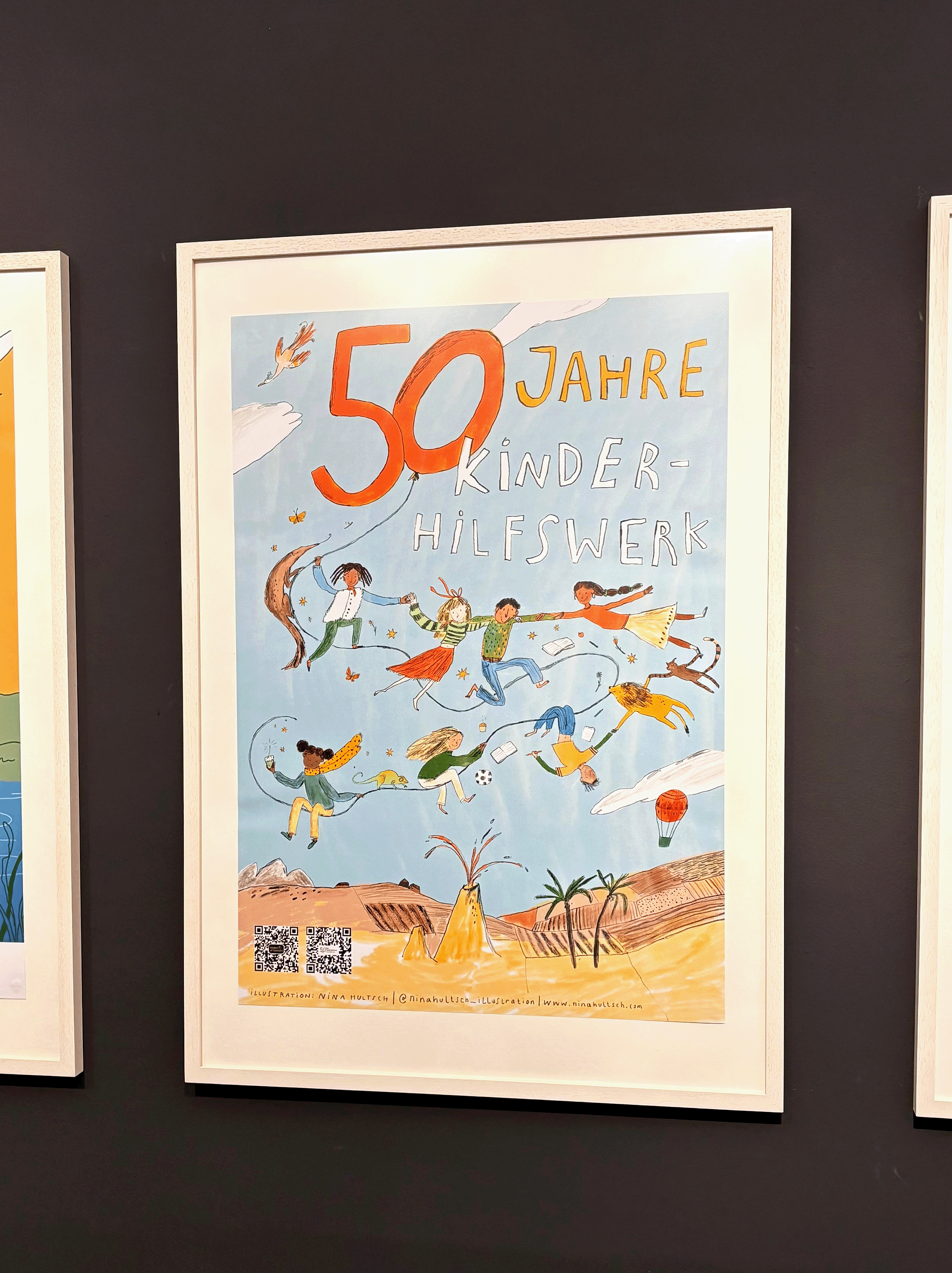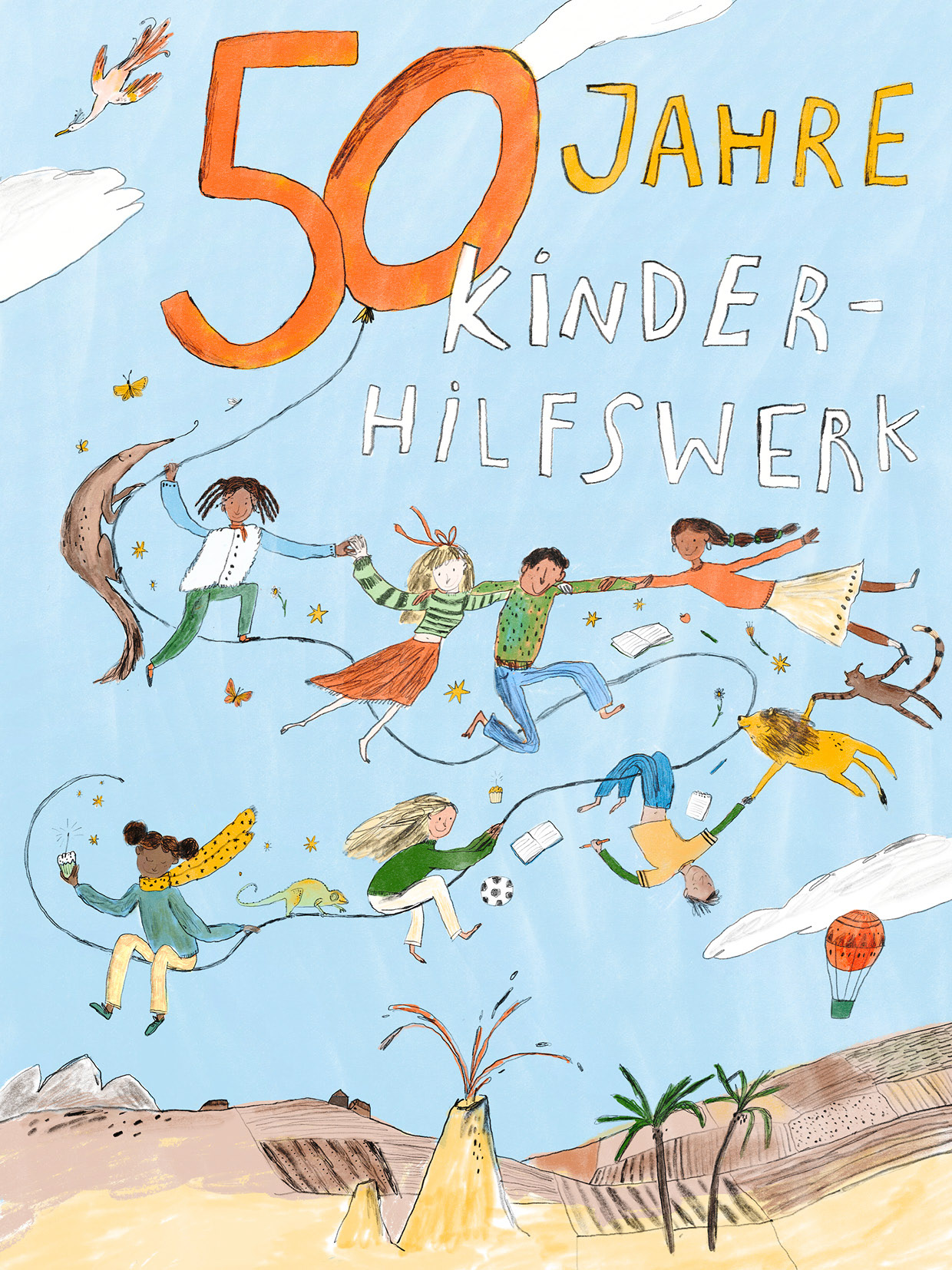 Since 1975 the aid organization Children's Fund One World (Kinderhilfswerk Eine Welt) initiates, promotes and supports projects aiming at health, care and education of young children and teenagers. For their 50 year anniversary I contributed some illustrations to a book showcasing their important work. Also I illustrated a poster for the occasion.
